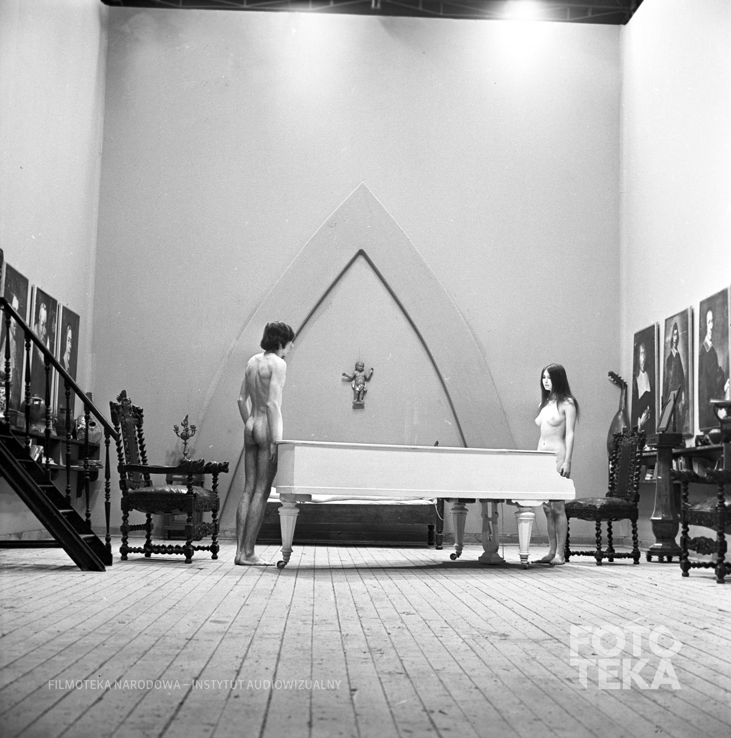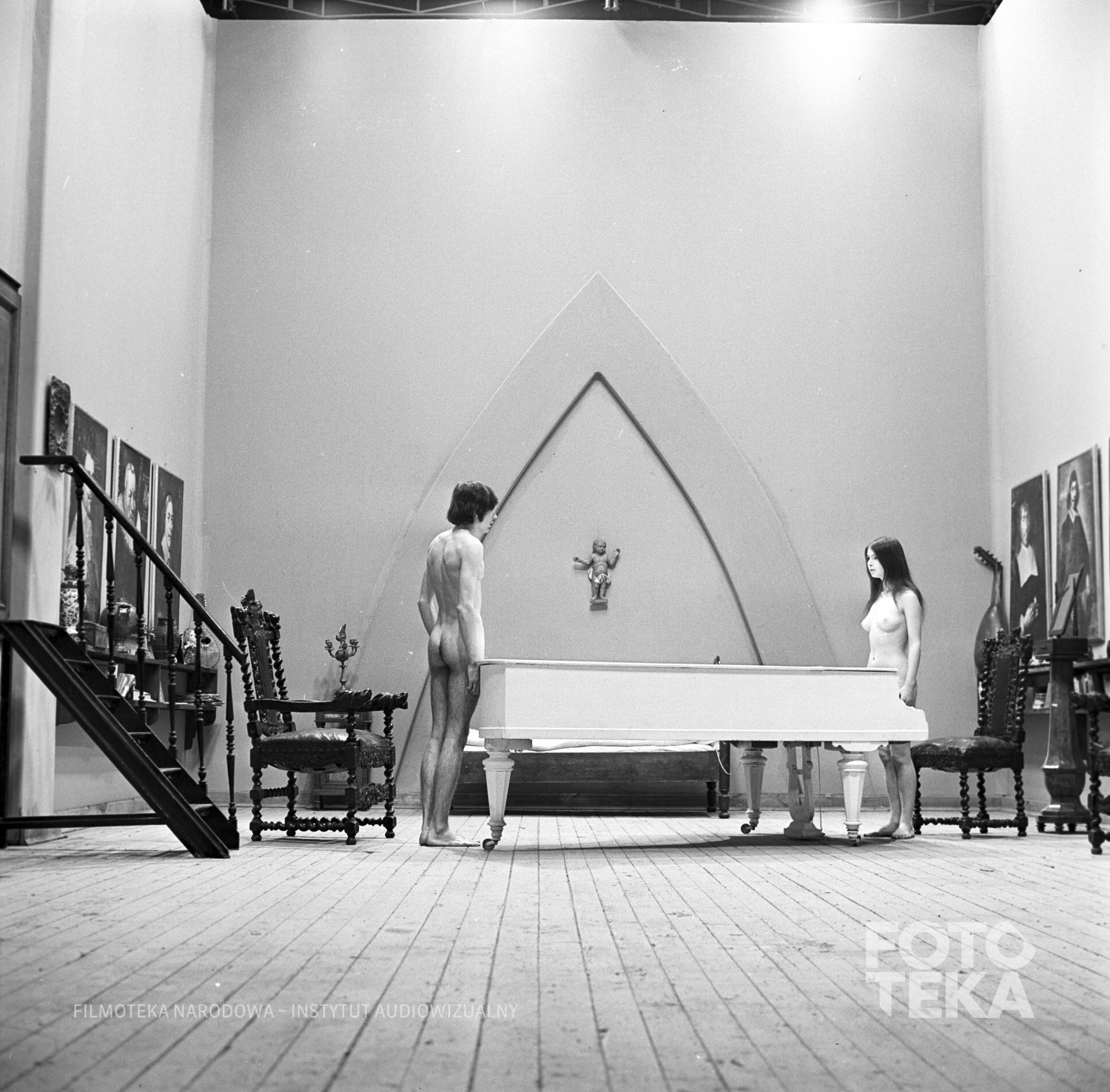 Opis: 1. Katarzyna prosi Tadeusza (Andrzej Malec), aby patrzył tylko na nią, gdy zdejmuje przed nim kolejne części ubrania. W końcu obydwoje stoją nago naprzeciw siebie, oddzieleni przysłaniającym ich częściowo dużym stołem.